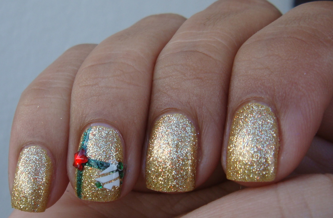 So I got a bit bored and since I am at home, I decided to do another festive mani. I went yesterday to Old Navy since I got a little cash as a gift from a relative. And I as was heading to the register I saw the Tip Toe np's from Old Navy. Not that I haven't noticed them before, but I was not gonna pay $3.50 for each bottle, lol! Anyhows I started looking inside the basket and there were some beauties! And for clearance $1.99 is an awesome price! This one has like pixie dust type glitter, gold and bits of red also, it is very pretty and a one coater. Does not feel very gritty at all, I applied one coat of CG Megabite, and one of Gold Dust. Then I said why not, let's do some nail art, lol! I am not very much of an expert freehanding, but those gift wrapped designs are so cute! Plus I added a couple of decals from Sally's.